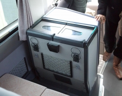 中型バスの冷蔵庫はほとんどが大型バスのものと変わらず、350mlの缶が約48本入ります。